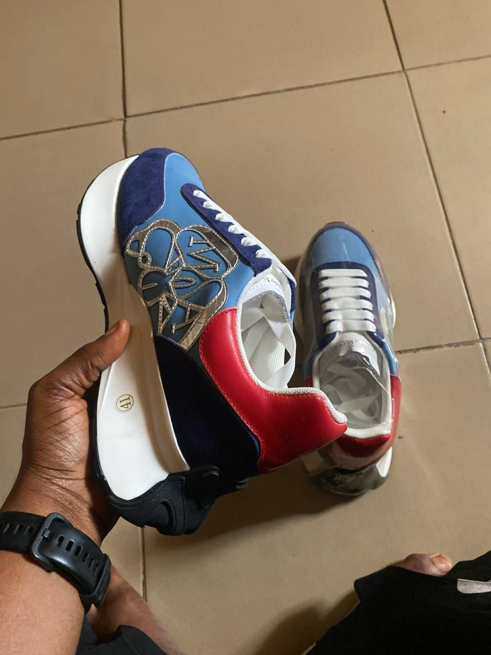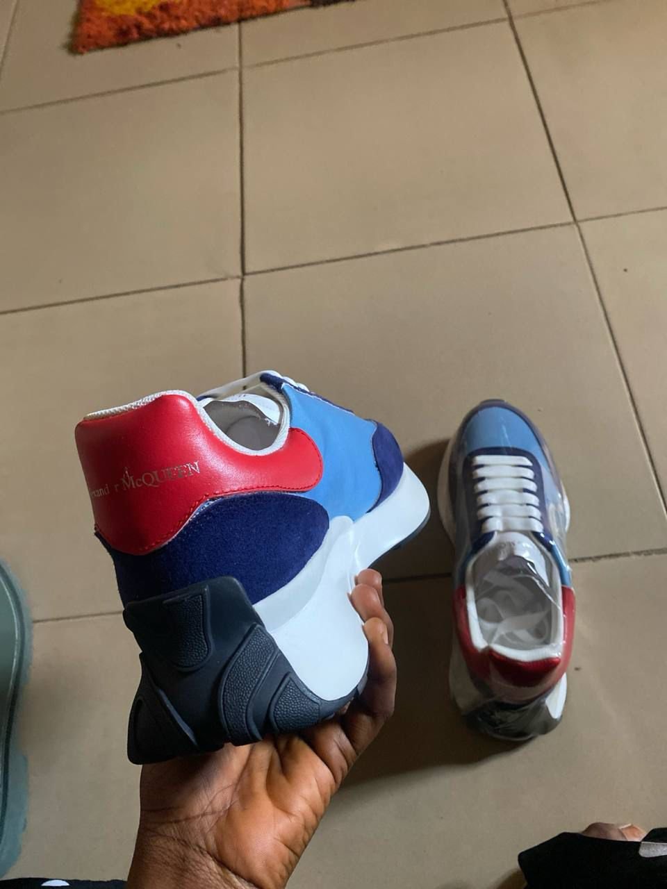 A modern interpretation of a classic running shoe, the Alexander McQueen Sprint Runner features a sleek, multi-toned design with a prominent metallic Seal logo on the side. Combining navy nylon, tonal suede, and a bold red heel counter, these sneakers sit atop a signature chunky oversized sole for a distinct high-fashion edge.