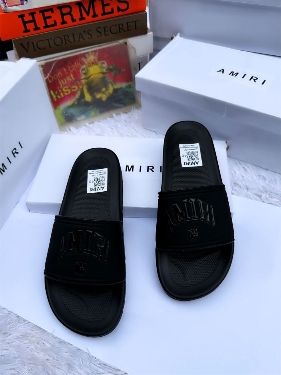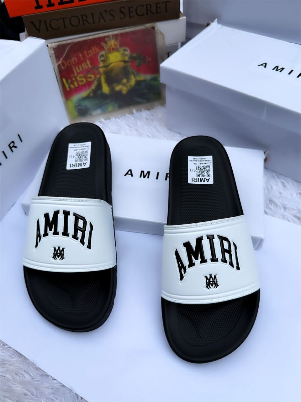 The design is centered around the bold, arched Amiri varsity lettering across the strap, complemented by the signature interlocking MA monogram embroidered just below. Designed for both poolside lounging and city strolls, these slides offer a molded footbed for an ergonomic fit and a textured outsole for reliable grip. Whether paired with sweatpants or denim, they deliver an unmistakable designer edge.
