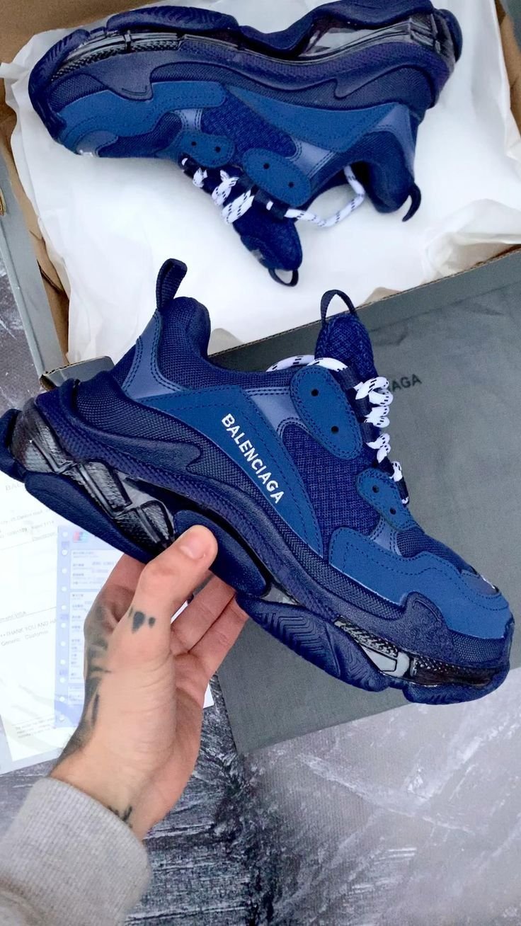 The Iconic Triple S. Embrace the original chunky trainer trend with this monolithic sneaker. Featuring a triple-stacked rubber sole, a multi-panel navy mesh and synthetic leather upper, and classic black-and-white rope laces. The ultimate high-fashion streetwear essential in a versatile deep blue.