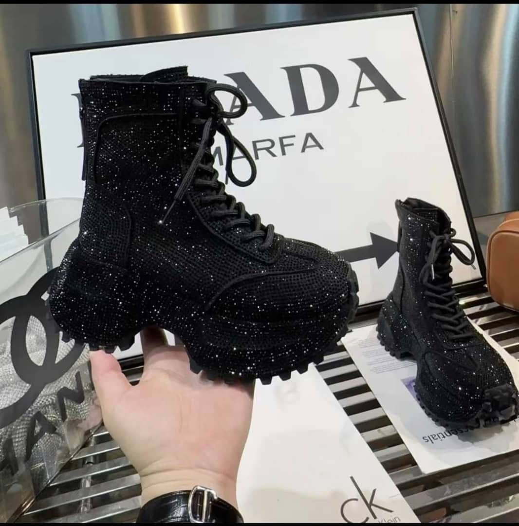 Turn heads with the Midnight Spark Crystal Combat Boots, the ultimate blend of luxury and edge. These statement boots are fully encrusted with fine black crystals that shimmer beautifully under any light. The thick, rugged sole provides all-day comfort and a bold lift, while the lace-up front and side zipper ensure a perfect fit. Designed for the confident trendsetter, these boots add instant sparkle and strength to any outfit — from casual denim to party-night chic. Step into the spotlight and let your style do the talking.
