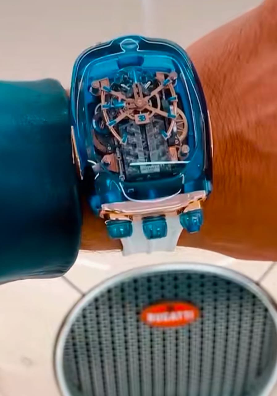 This stunning Jacob & Co. Bugatti Chiron Tourbillon features a transparent sapphire crystal case, showcasing a fully operational, miniature W16 engine block with moving pistons and a triple-axis tourbillon. A breathtaking tribute to speed and haute horlogerie.
