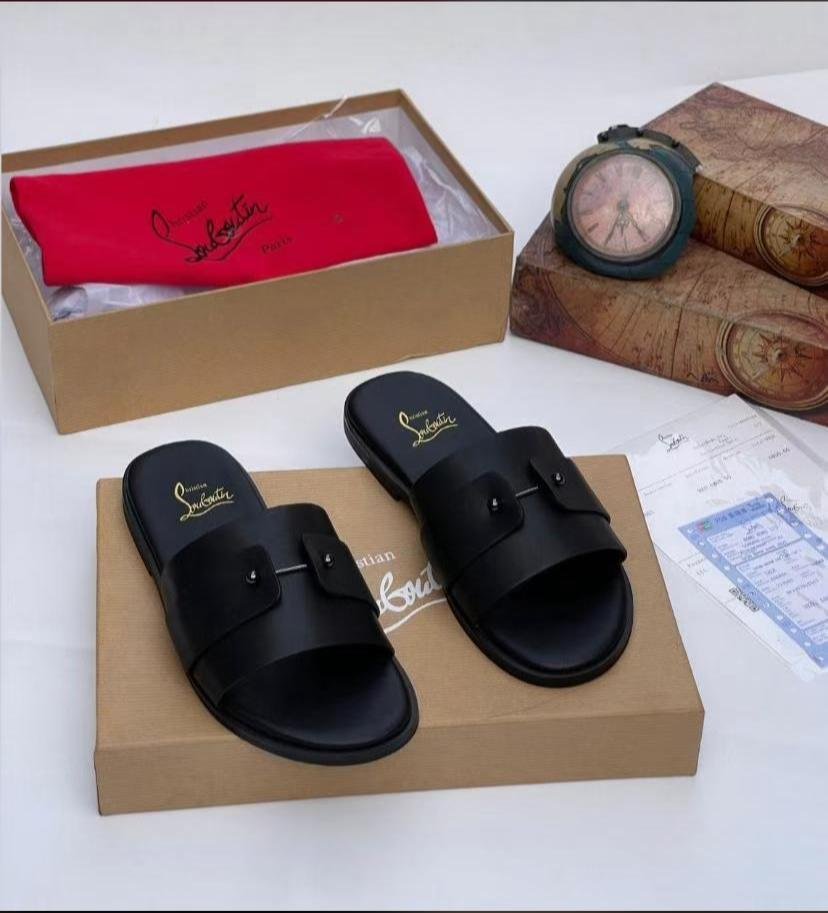 Elevate your leisure wardrobe with these meticulously crafted leather slides, inspired by the bold elegance of Christian Louboutin.