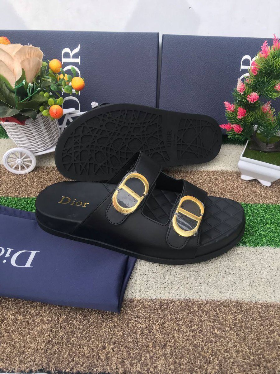 Crafted for the modern wardrobe, these double-strap slides offer a sophisticated take on classic poolside footwear. The sleek black matte finish is complemented by two prominent gold-tone “CD” buckles, adding a signature touch of luxury to the design.