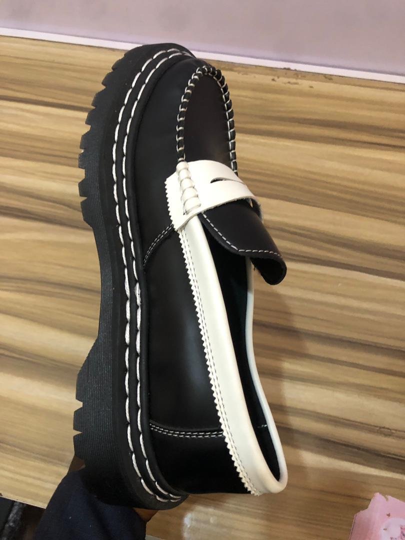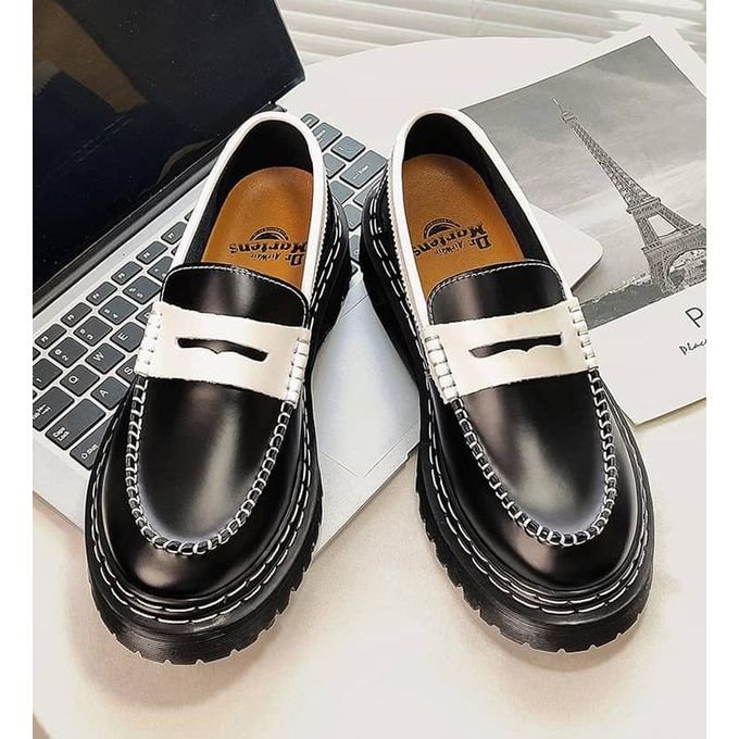 A bold, contemporary take on the classic penny loafer, featuring a high-contrast black and white colorway, chunky platform soles, and signature contrast stitching for a rebellious, subcultural edge.