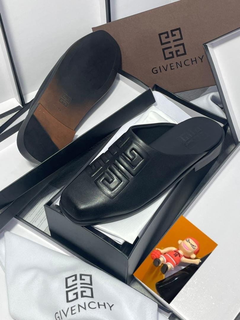 Elevate your smart-casual look with these luxurious backless loafers. Crafted from premium black leather and featuring the striking embossed Givenchy G-Cube logo across the vamp. Perfect for effortless style and all-day comfort. Comes in the original packaging.