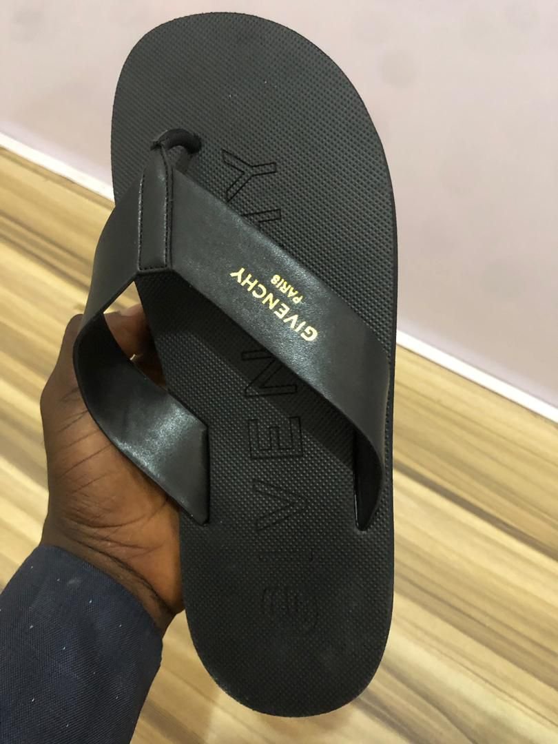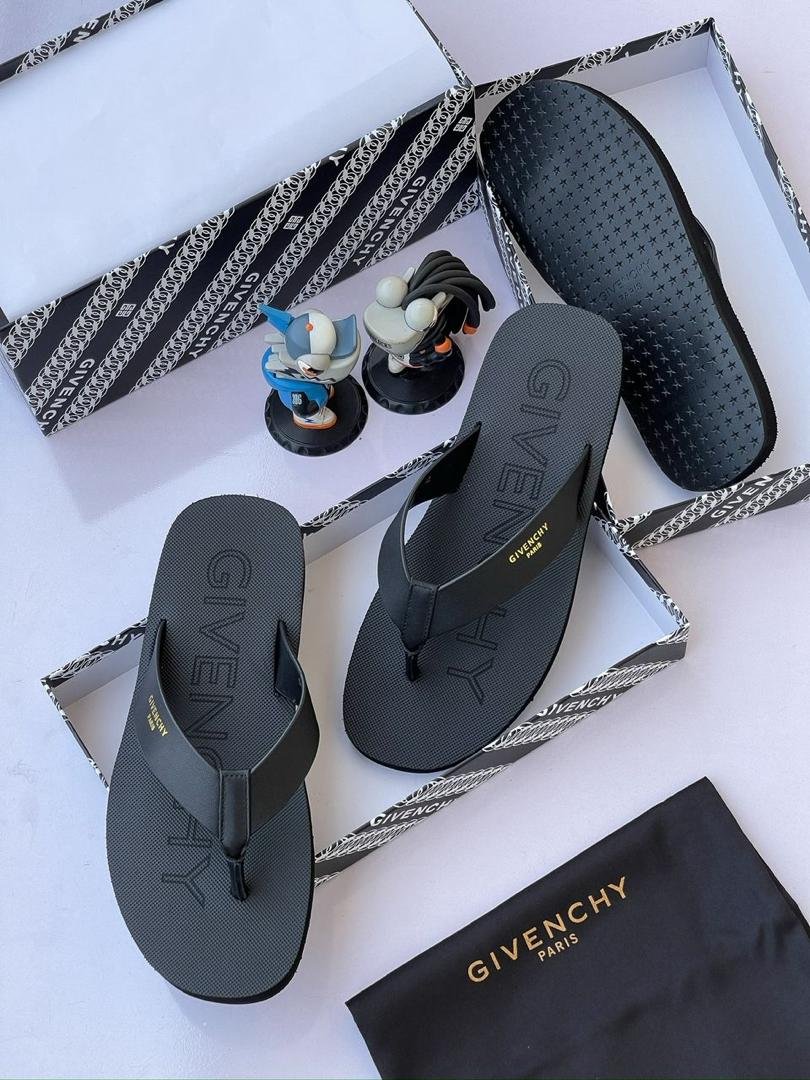 The design is defined by its sophisticated all-black aesthetic. The footbed features a tonal, oversized “GIVENCHY” logo embossed across the surface, providing a subtle yet distinct texture. The slim, ergonomic straps are finished with a delicate gold-toned “GIVENCHY PARIS” signature, adding a touch of prestige to the minimalist profile. Complete with a non-slip outsole patterned with the iconic 4G logo, these flip-flops are an ideal companion for the pool, beach, or casual city outings.