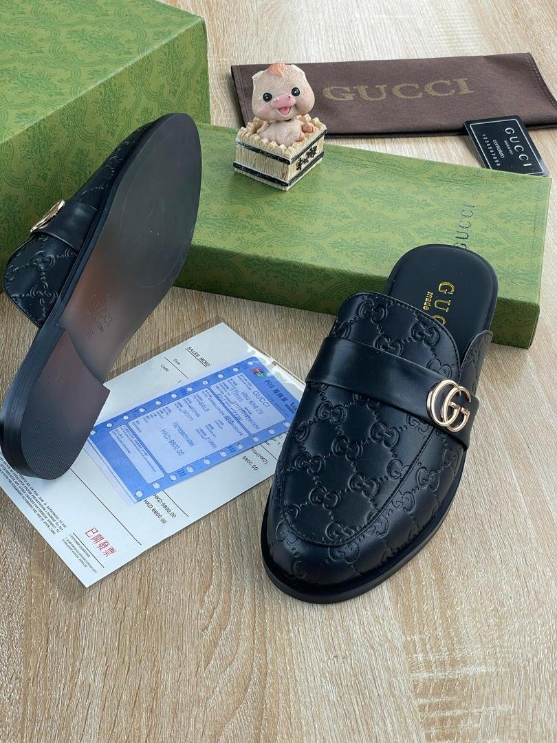 Iconic Gucci Black Backless Slipper. A sophisticated slip-on mule crafted from rich black leather, featuring the signature GG monogram pattern subtly embossed throughout. Finished with the recognizable gold-tone Interlocking G hardware strap, this shoe delivers effortless luxury and comfort for year-round wear.