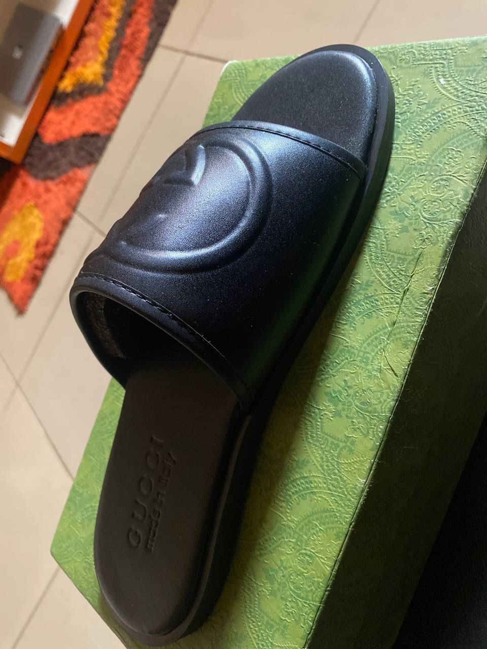 The minimalist design is balanced by functional craftsmanship, including a contoured footbed for all-day support and a durable rubber sole for traction. The footbed is finished with the iconic “Gucci made in Italy” heat-stamped branding. Whether paired with tailored shorts for a coastal getaway or styled with relaxed trousers for a city stroll, these slides offer a seamless blend of high-fashion aesthetics and everyday versatility.