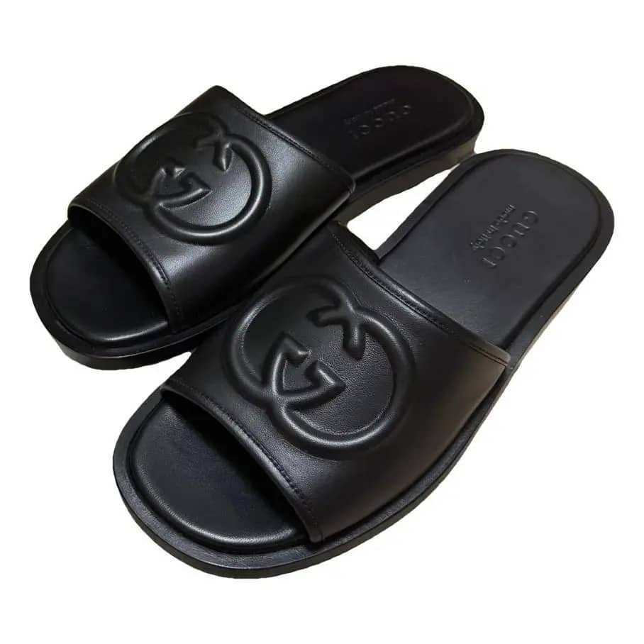 sleek and sophisticated open-toe slide featuring premium black leather and an embossed Interlocking G logo. Designed for effortless luxury and casual comfort, this Italian-made footwear is a staple for refined warm-weather styling.