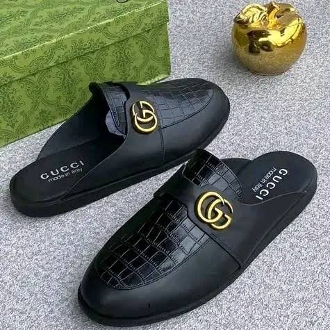 Step into pure luxury with the *Gucci Noir Prestige Mules* — crafted with premium black leather, crocodile-textured detailing, and the iconic interlocking “G” emblem for a bold, elegant finish.