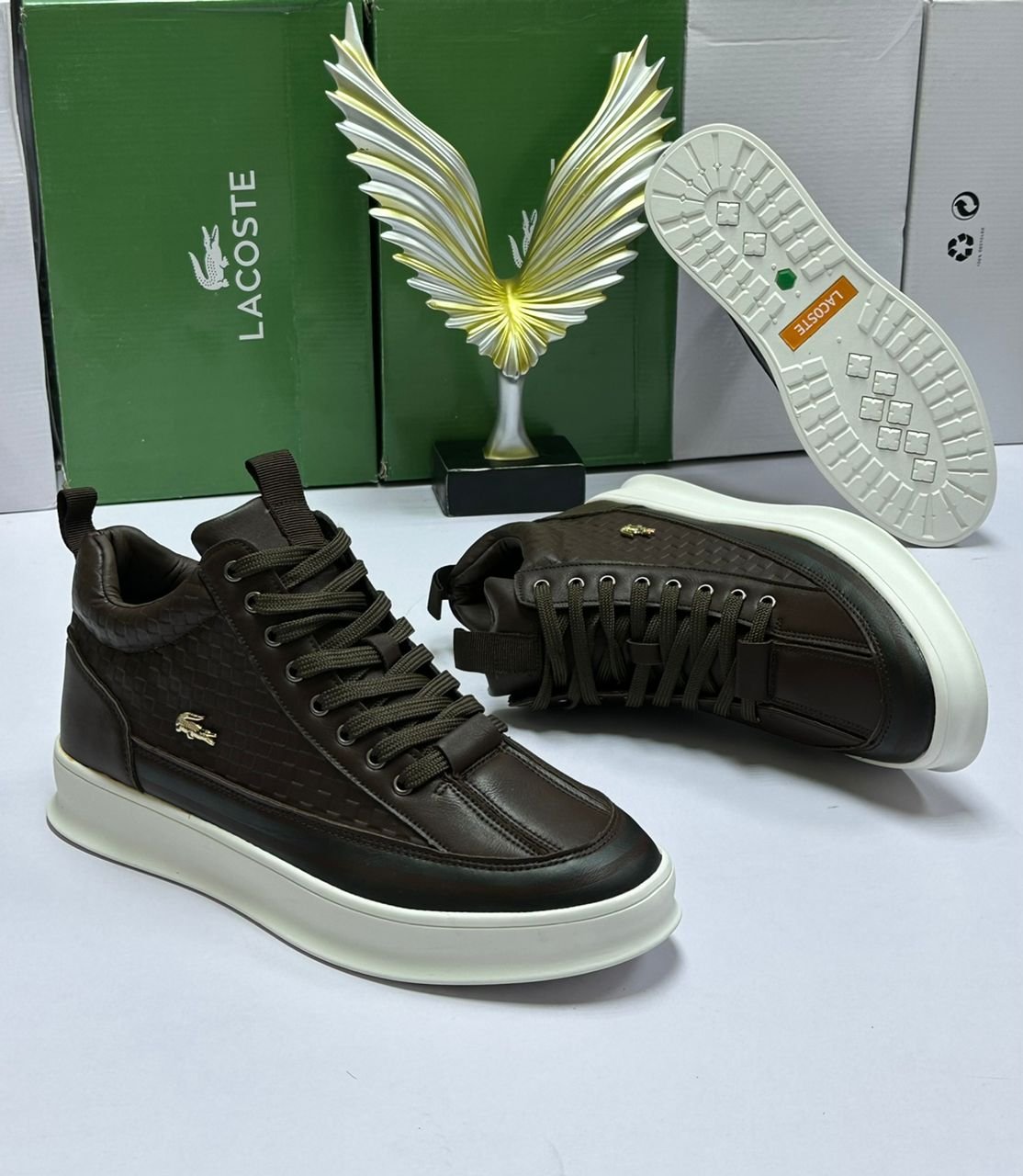 These Lacoste mid-top sneakers blend urban style with premium craftsmanship. Featuring a geometric-textured synthetic upper, contrasting stripe design, and Lacoste’s iconic crocodile logo in metallic gold on the side, these shoes offer a bold statement. The durable rubber outsole provides traction and comfort, while the cushioned insole ensures all-day wearability. Whether in black or brown, this pair delivers versatility and fashion-forward appeal, perfect for elevating your everyday streetwear.