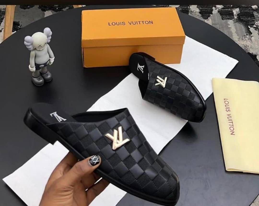 Luxurious backless slip-ons crafted from black leather featuring an embossed Damier pattern and a prominent gold-tone LV initial hardware. The perfect blend of casual comfort and signature luxury.