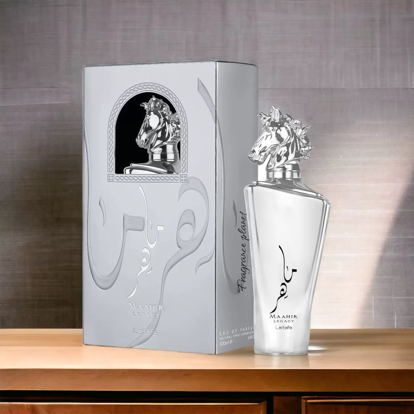 Lattafa Maahir Legacy is a powerful and elegant Eau de Parfum, featuring a sophisticated blend of fresh and deep notes.Its striking white bottle is crowned with an intricately sculpted silver horse head stopper, symbolizing nobility and strength. A long-lasting fragrance for those who command presence and appreciate refined luxury.