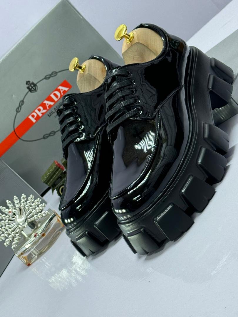 The shoe features a sharp Derby-style upper crafted from jet-black patent leather. This high-shine finish provides a luxurious, polished look that sharply contrasts with the matte texture of the sole.