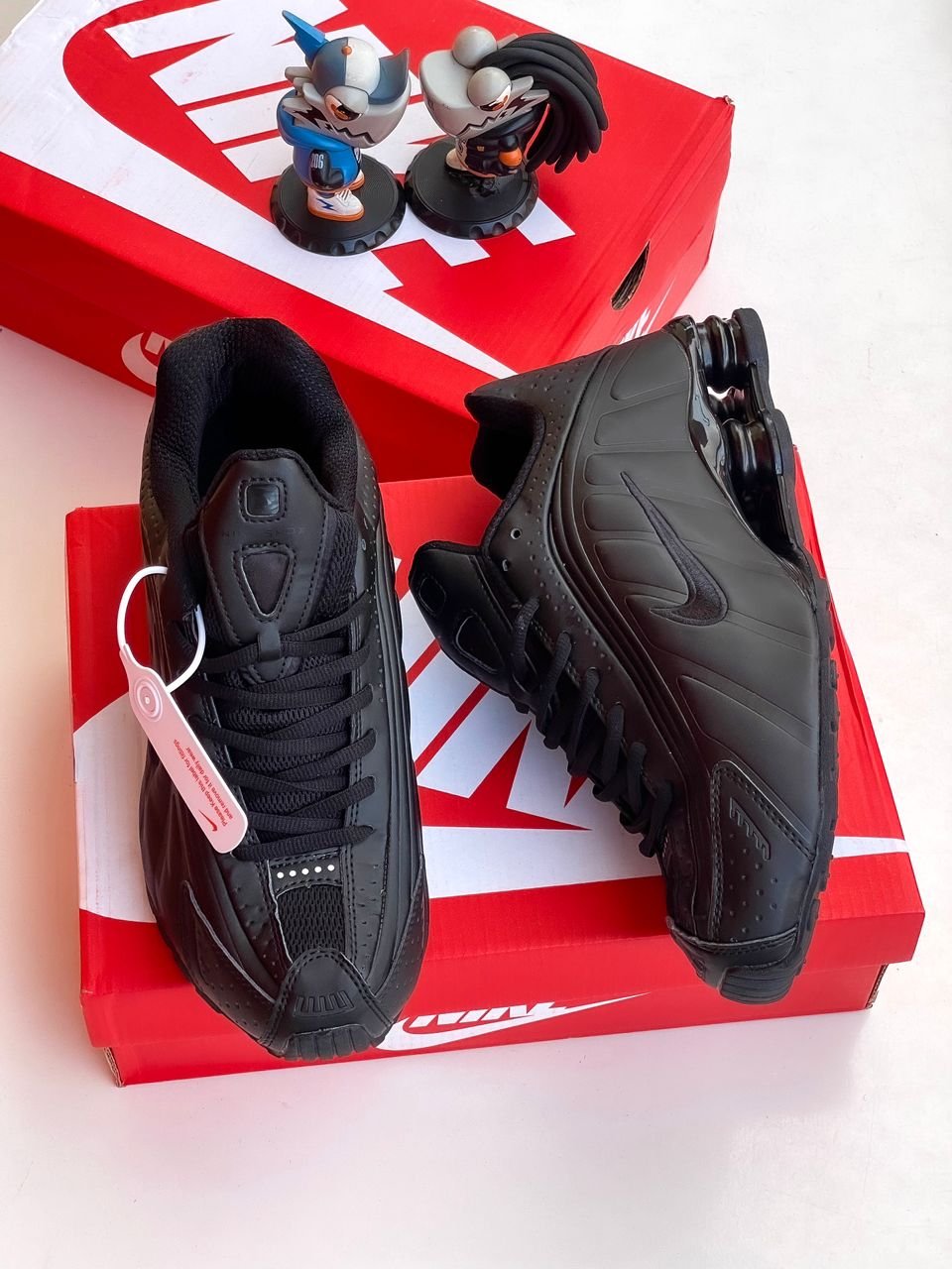 Step into stealth mode with the **Nike Shox R4 “Triple Black”**, a modern icon that fuses style and performance. Dressed in an all-black colorway, this sneaker is crafted with a mix of premium synthetic leather and mesh for durability and breathability. The signature Shox cushioning system in the heel delivers responsive comfort and impact protection with every step, while the aggressive outsole ensures lasting traction.