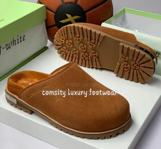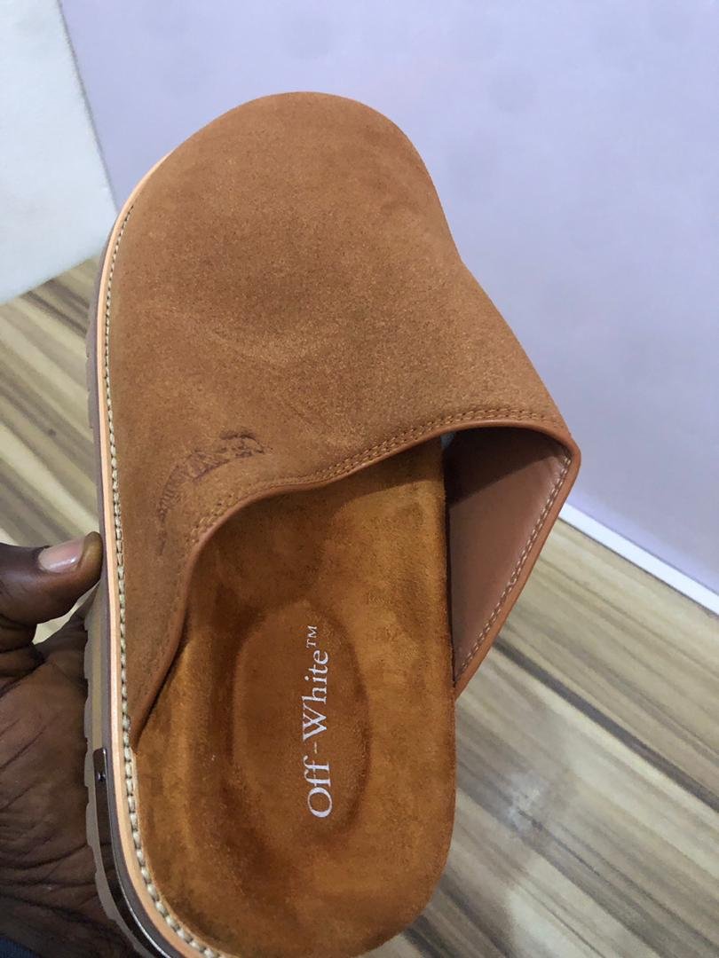 A luxury tan suede mule featuring a robust, heavy-duty lug sole and signature Off-White™ industrial branding. Perfect for a high-fashion take on casual comfort.
