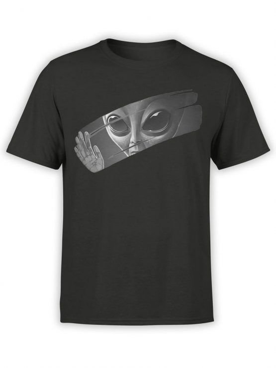 A classic black t-shirt featuring an edgy, monochromatic graphic of a Grey Alien face peering out and waving from behind a dark, ripped-looking screen. A perfect tee for sci-fi fans and those who love a mysterious aesthetic.