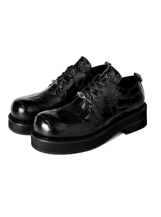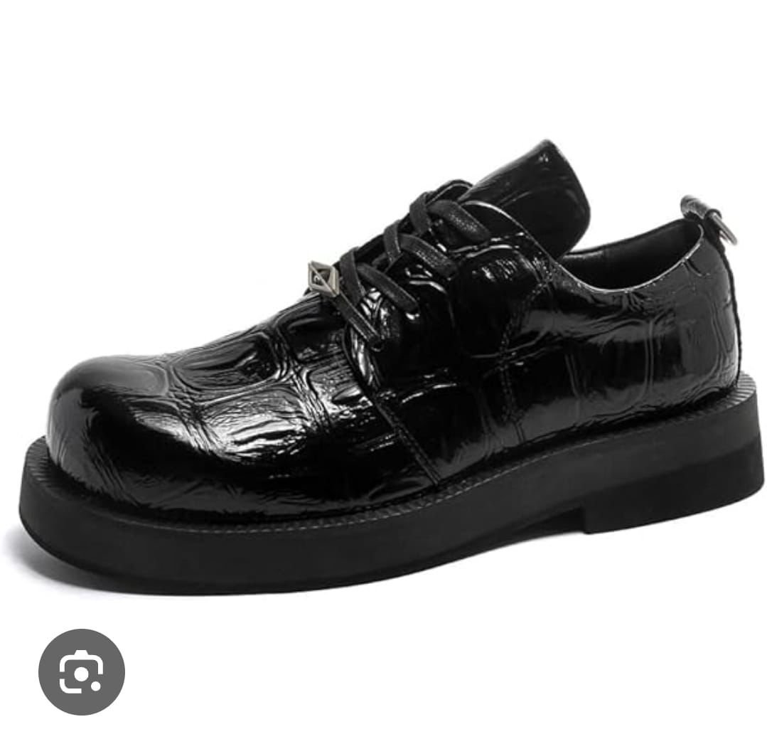 Unleash your inner rebel with The “Crocodile Stomp” Oxford, a shoe that defies convention. Crafted from high-gloss patent leather with a dramatic crocodile-embossed finish, this derby shoe demands attention. The oversized, chunky platform sole adds significant height and a heavy-duty, grounded aesthetic, perfectly balancing the luxurious texture of the upper. Details include robust tonal laces, a slightly extended tongue, and a discreet yet edgy metallic pyramid stud near the eyestay, adding a subtle punk rock flair. Ideal for those who view fashion as a form of expression, these shoes are not just an accessory—they’re the centerpiece of any contemporary, avant-garde, or goth-inspired outfit. Comfort meets cutting-edge style.