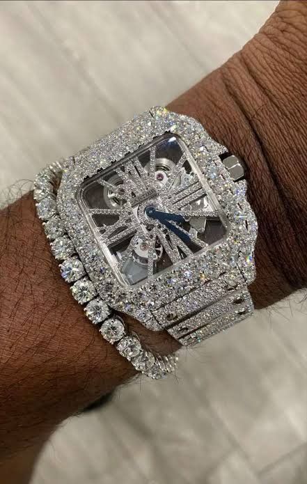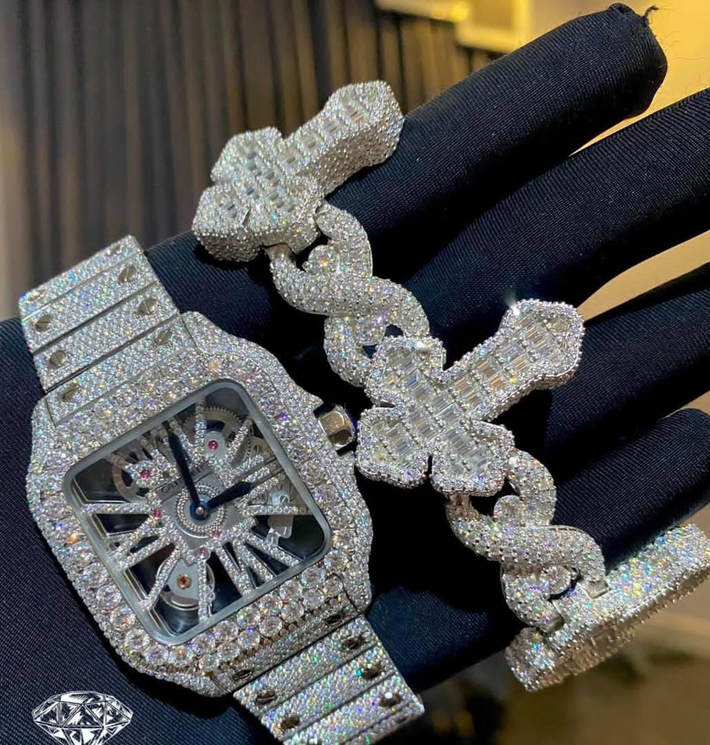 Command attention with *The Frost Monarch Set* — a fully iced-out masterpiece featuring a skeleton luxury watch and a bold diamond Cuban link bracelet. Precision meets prestige in every shimmering facet.