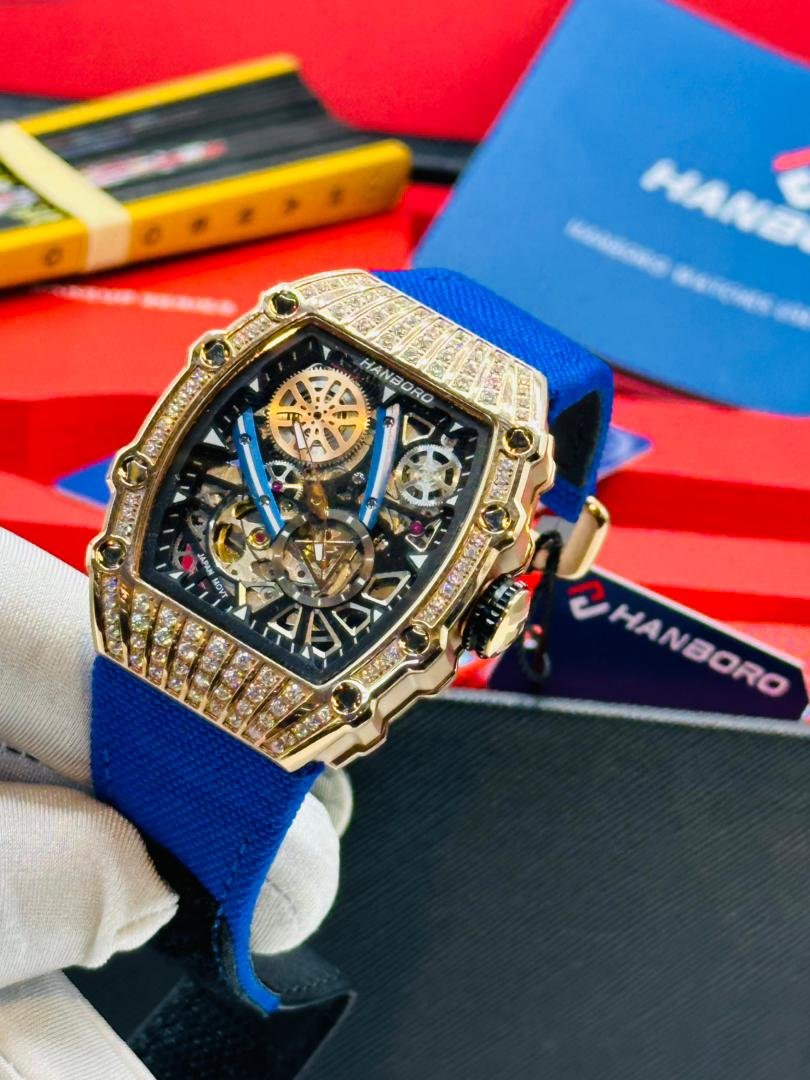 The aggressive, tonneau-shaped case is finished in a luxurious rose gold-tone, offering a sophisticated warmth that contrasts brilliantly with the rest of the design. This bold case is seamlessly paired with a custom, high-visibility orange/red textile strap, ensuring the watch stands out in any setting. The strap’s vibrant color and comfortable texture make the ‘Inferno’ as practical for daily wear as it is a showstopper.
