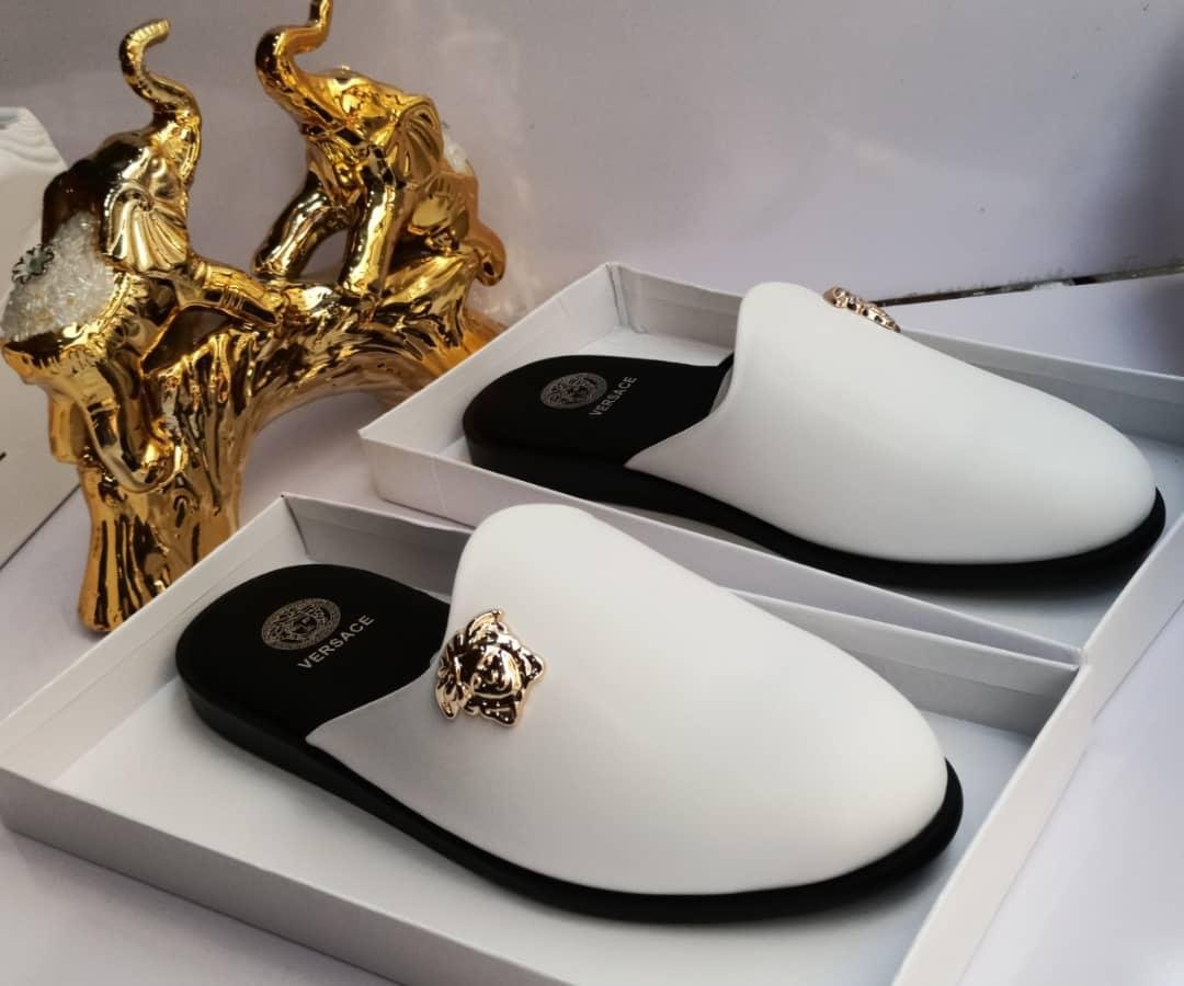 Elegant white slip-on mules featuring a plush velvet-like upper, a contrasting black sole, and finished with a striking gold-tone Medusa emblem. Perfect for elevated loungewear or sophisticated casual ensembles.