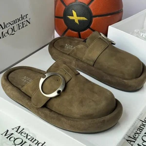 Elevate your off-duty wardrobe with these distinctive Alexander McQueen mules, which seamlessly blend industrial edge with cozy luxury. Crafted from plush, high-quality Italian suede in a versatile olive/khaki earth tone, these shoes feature a rounded, bulbous toe and an innovative integrated platform sole that provides both height and stability.